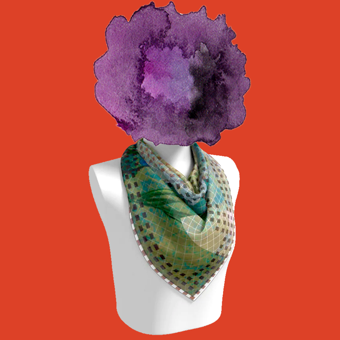 Soft, impressionistic florals are pulled into a square of silk, then grounded with a modern logo grid. It reads classic and contemporary at the same time—like a painting that knows its angles.