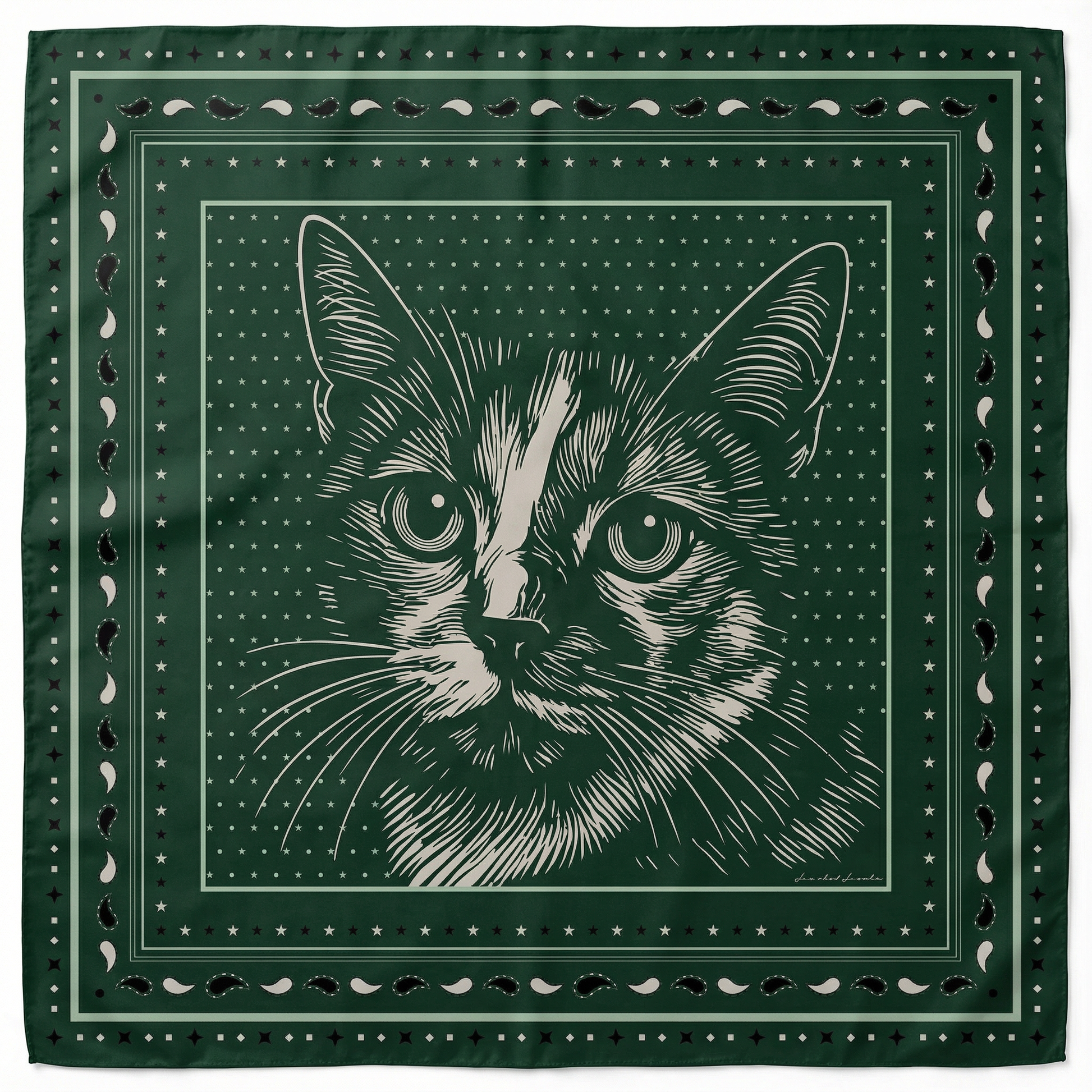 —Star-and-paisley border in deep hunter green and black