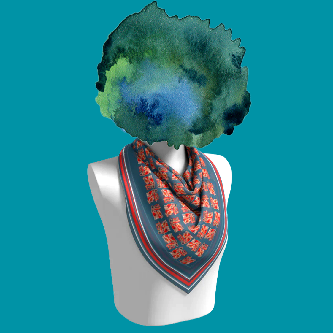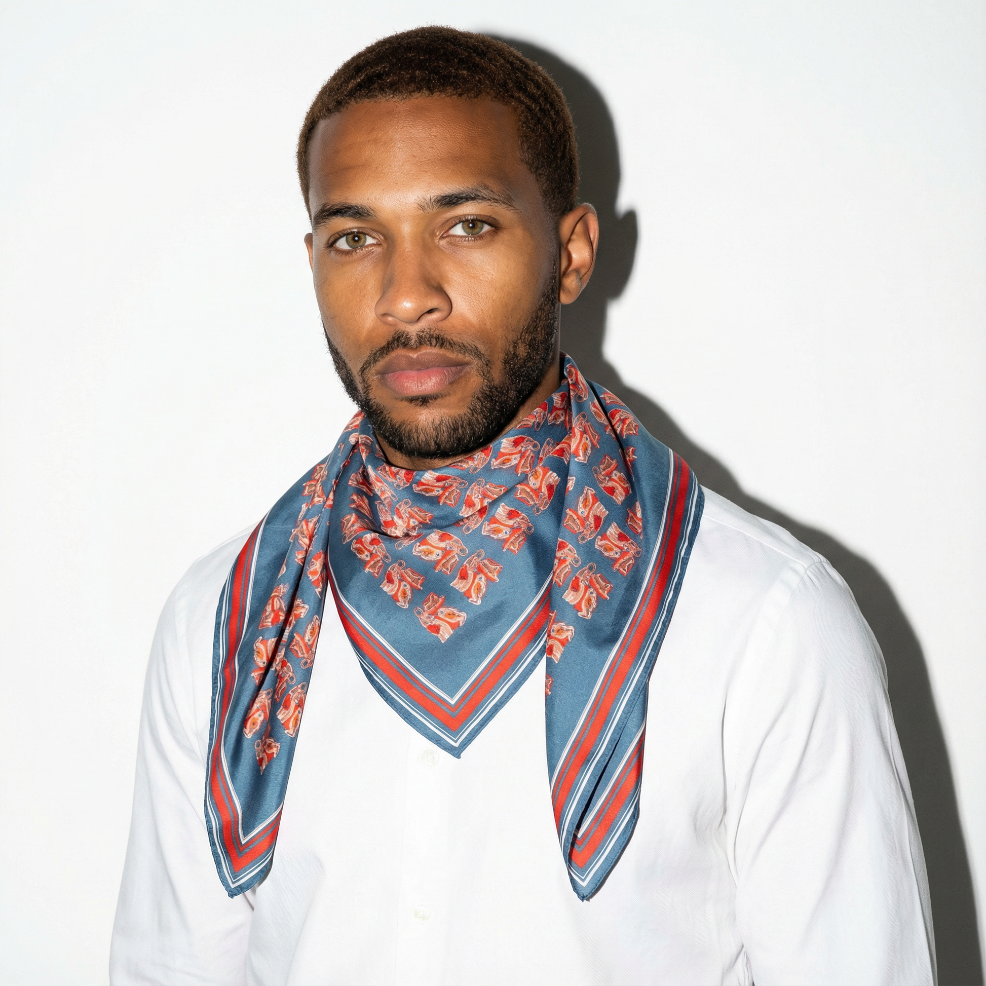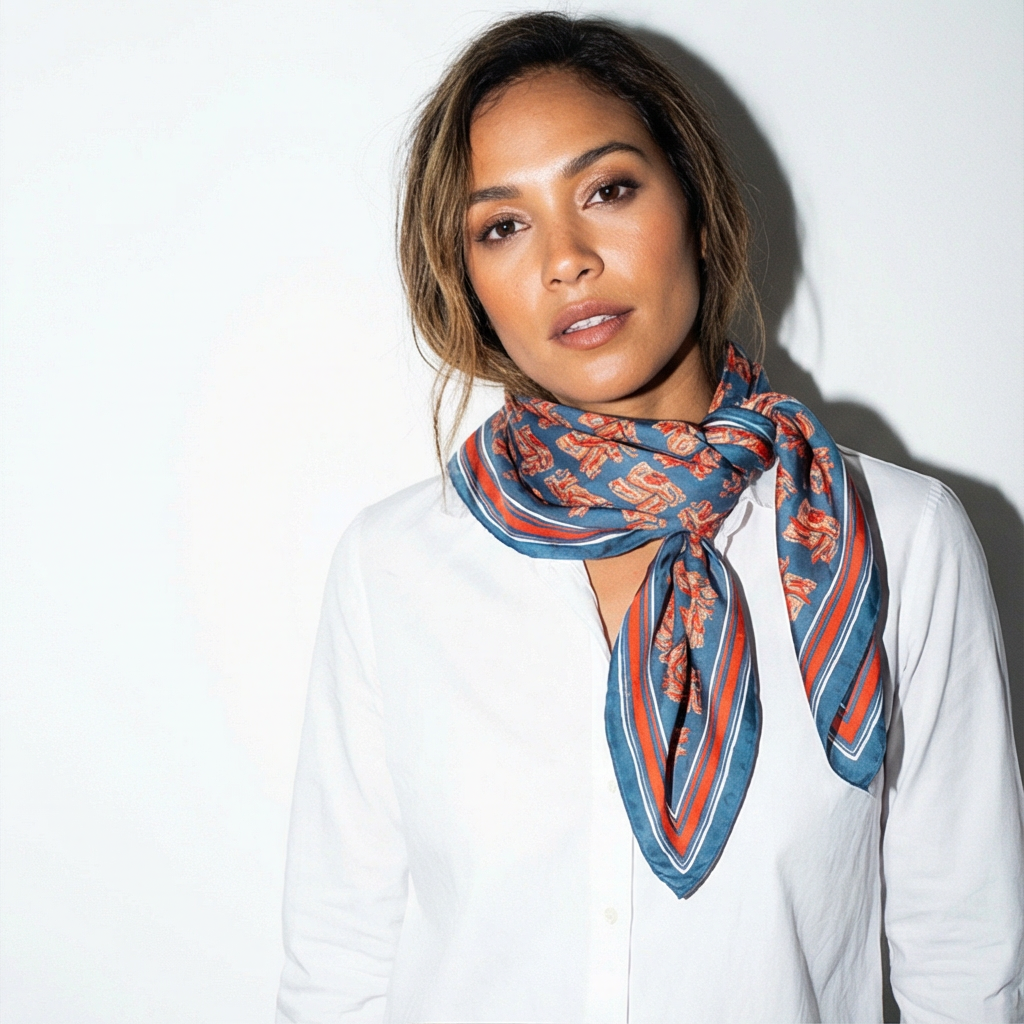 It riffs on classic seaside postcards—sun-faded in spirit, but punched up in red, white, and navy. The striped border keeps everything tight, so it folds and ties with a lot of payoff for not much effort.